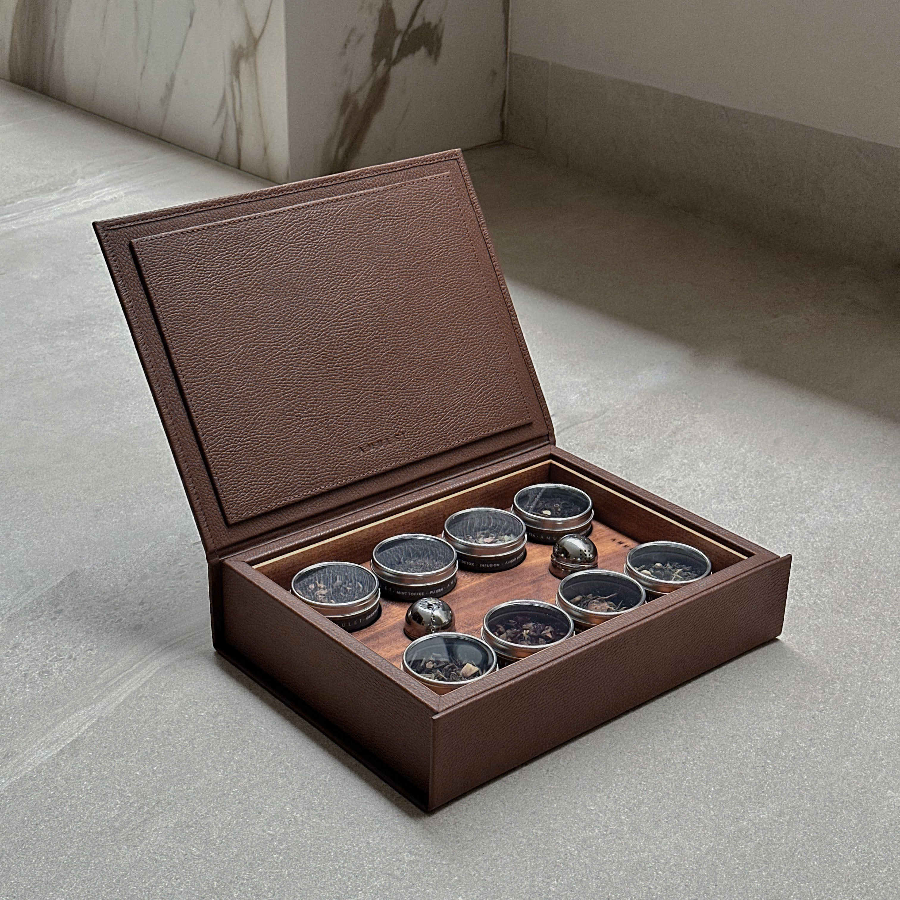 Descubre Tea Reverie, una colección de cajas de piel hechas a mano para quienes ven en el té algo más que una bebida. Diseñadas para organizar y resguardar tus tés e infusiones con el mismo cuidado con el que eliges cada taza, combinan estilo, calidez y sofisticación.
